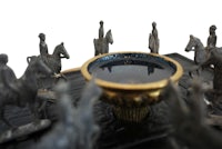 Carved wood, brass, resin, lead,gold,animal fat,fire.